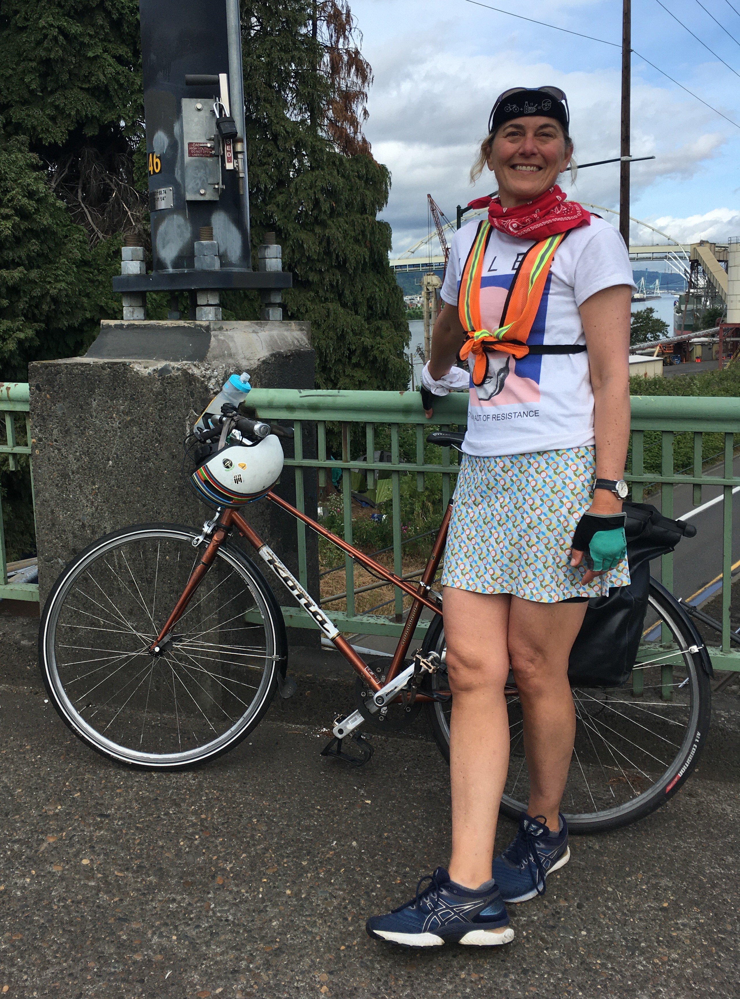 Me, in my beloved favorite biking city, a few years ago. (As often - Idles Band, Joy As An Act of Resistance t-shirt on under the reflective vest)
