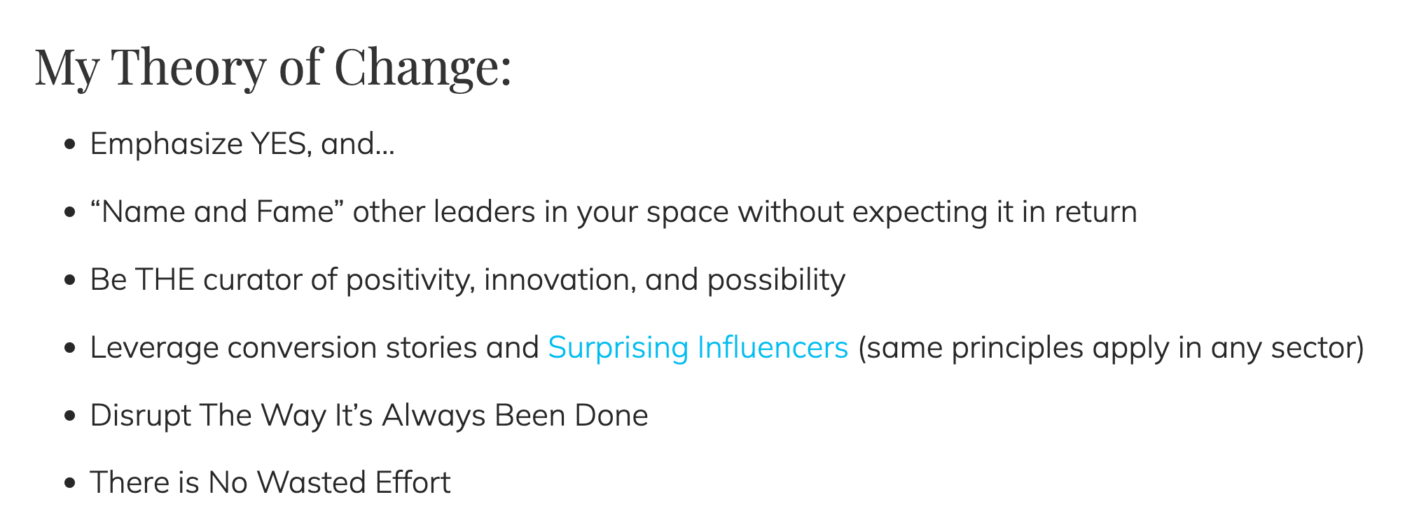 Then - alongside Carucci and de Grosbois, I put my own long-standing Manifesto and Theory of Change . It seems to run counter to any process my clients or listeners have otherwise come across:
